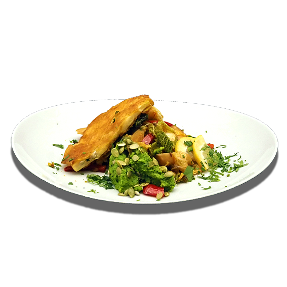 Sellerie Madras Schnitzel mit einer Gemüsepfanne und Erbsen-Minzdip